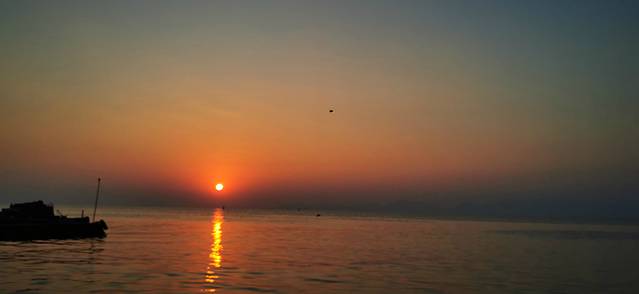 太阳越出海平面的那一刻,可以直视它,红红的,却不刺眼。