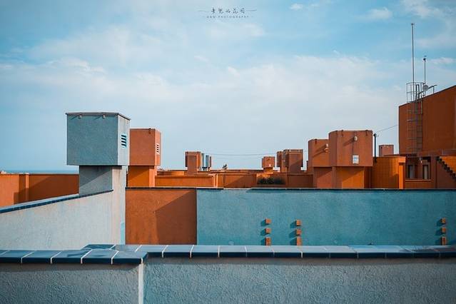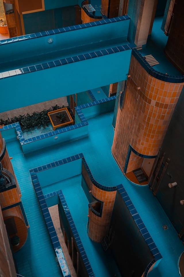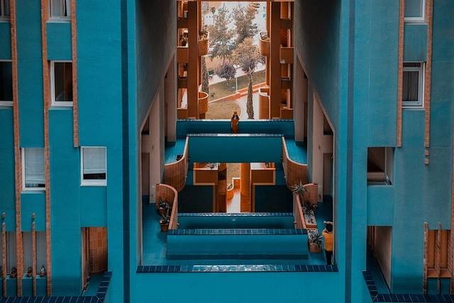 红色的外墙,蓝绿色的走廊,强烈的颜色对比让这里看起来更加魔幻。