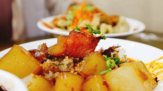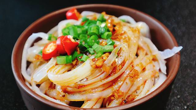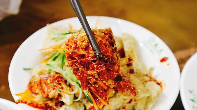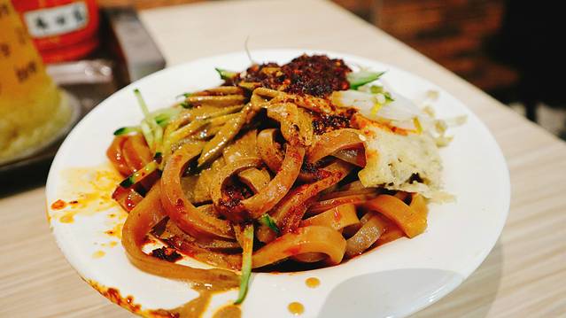 吃第一口时,我甚至认为这是油泼面,其实真的很像,驴蹄子面不是驴蹄子肉哦,只是它的面叫驴蹄子,超级厚实,口感相当有嚼劲,味道就是油泼辣子的香辣口,有荤有素,搭配很好,包你吃饱