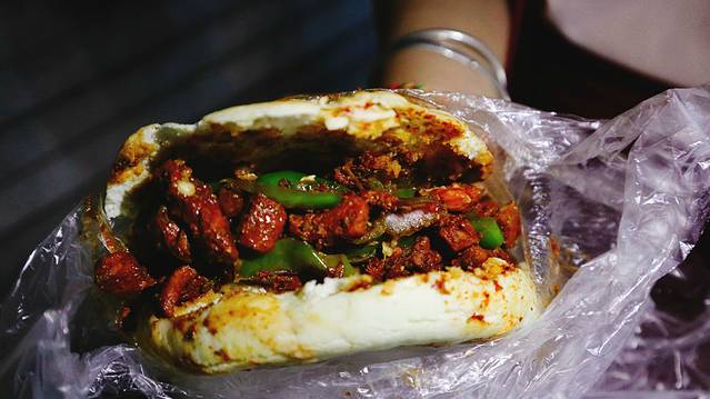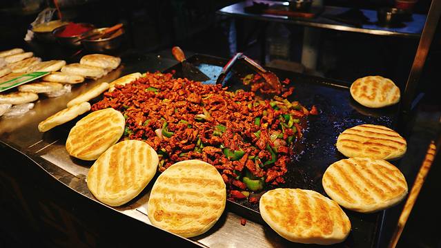 这边肉夹馍很香辣,一堆肉夹在饼里,咬一口真的巨满足。