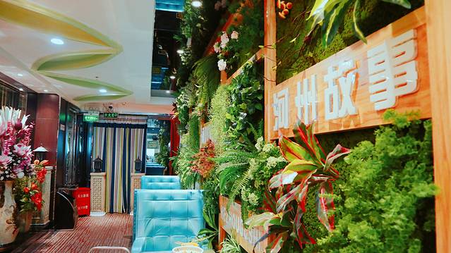 导航至此,上到2楼,迎面大大的四个字,“河州故事”嵌在了花花草草的景观中,很是小清新,进店就是就餐大厅了,这种既雅致又清新的装修风格让人格外的舒服。