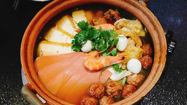 食材很丰富,汤的味道清淡不油腻,锅下有卡式炉,凉了可以自行加热,推荐!