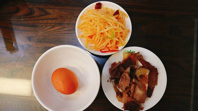 我们点了牛肉面+鸡蛋+牛腱子+小菜,本地人告诉我们这属于牛肉面的豪华吃法,肉蛋双飞加小菜,让你体验感满满