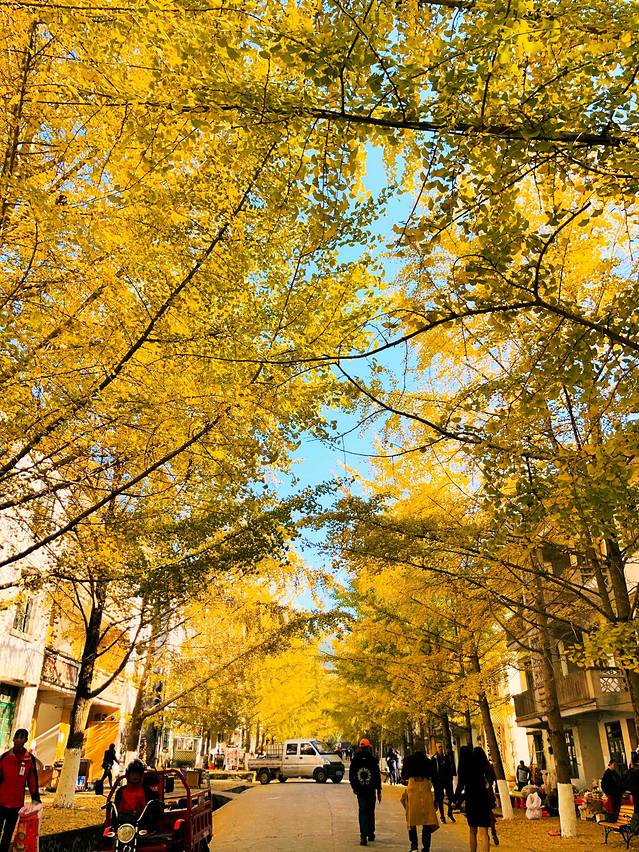 林场上山路上会有几个点有银杏,可以边走边拍照,10点左右人流开始多了起来,游览车开始载着一批批游客上来,还好已经抢先拍了一波照,上午阳光甚好,洒在黄金大道上美极了,道路两旁有复古的小房子,也有当地人卖小吃及特产。