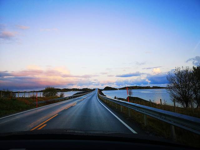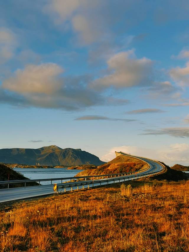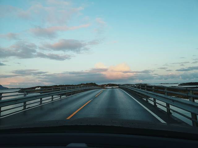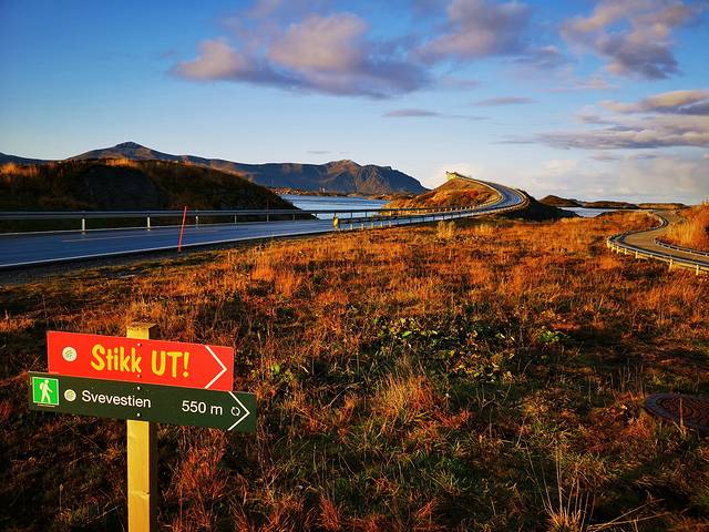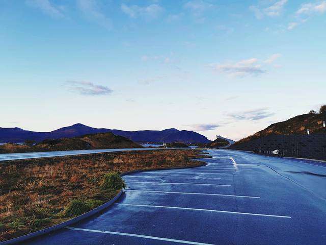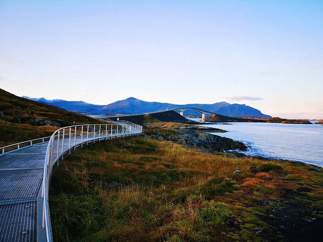 早晨从民宿出发时,天蒙蒙亮,还看到了好几头鹿,来不及拍照,一溜烟就跑走了。这家民宿真的是挺偏僻的,很有林间小屋的感觉。大西洋海滨公路是挪威的国家旅游线路之一,全长36公里,从Bud到Kristiansund,横跨七座桥,而且是免费通行的。我们要去拍照打卡的,就是最著名的“断头桥”Storseisundet Bridge,有个观景的步道。我们去的时候,一个人也没有,周围只能听到海浪声,和海鸥的叫声。