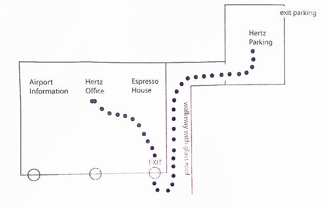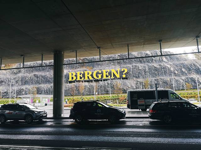 取完行李出来,就能看到HERTZ租车柜台,没什么人排队,很快办完手续。卑尔根机场航站楼挺小的,出来以后发现迎面是一座山,上面写着BERGEN,后面还加了一个大大的问号。哈哈,这个蛮幽默的,因为卑尔根是一个四面环山的城市,周围七座大山,又被称为“七山之都”。