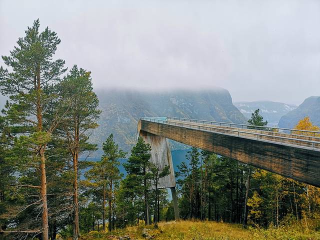 从弗洛姆小镇出发,第一站就是Stegastein观景台,车程20公里。在斯特伽斯特恩观景台(Stegastein Viewpoint)上可一览艾于兰(Aurland)峡湾的美景,而这座观景台本身就是挪威国家旅游线路的一部分。观景台伸出山崖30米,很有设计感。