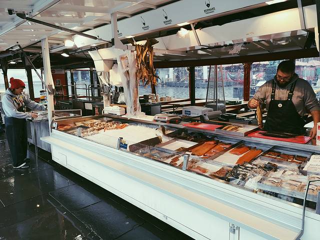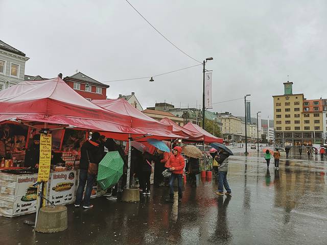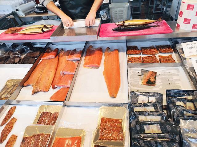 出发前,路过布吕根码头边上的鱼市,虽然下雨,但是有搭棚子,有点像大排档那种,可以买完了在旁边吃那种。问了一下三文鱼的价格,真的是贵出天际,建议大家还是去超市买,比较划算。后面我们在超市买的三文鱼,大概是鱼市价格的一半。
