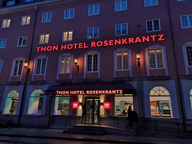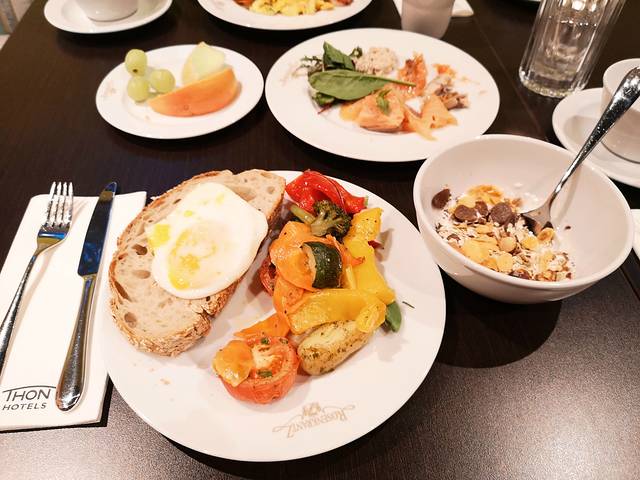我们入住的酒店是Thon Hotel Rosenkrantz,从Booking上订的,超级推荐。四星酒店,位置相当好,步行3分钟可达布吕根码头。非常适合自驾,因为酒店对面就是停车楼,一晚上250克朗,离开的时候在自助机上缴费,这个价格在挪威真的是高性价比了。再说说房间,也是很宽敞,很干净的,有的房间是带浴缸的,入住的时候可以提要求,前台都很Nice,会尽量帮你协调。重点推荐一下这家酒店的餐食,房间是含早晚餐的,这一点真的是完美。晚餐属于轻食那种,早餐格外丰盛,三文鱼、金枪鱼,水果饮料,应有尽有。重点说一下水果,真的让我惊呆了,每一个都很像道具,像假的一样,因为真的太好看了,颜色也非常鲜艳,怎么那么好看啊。