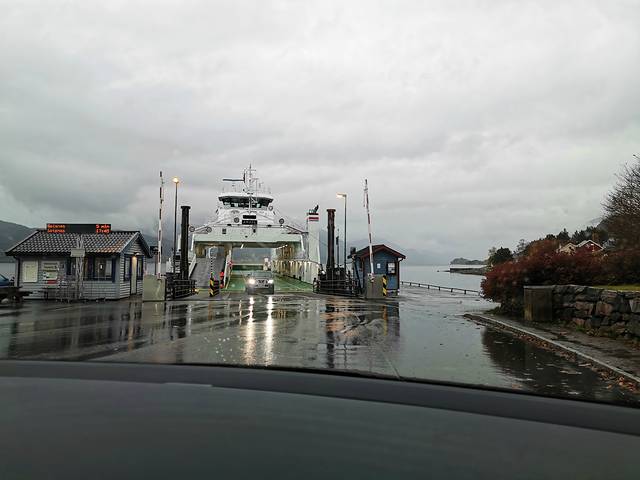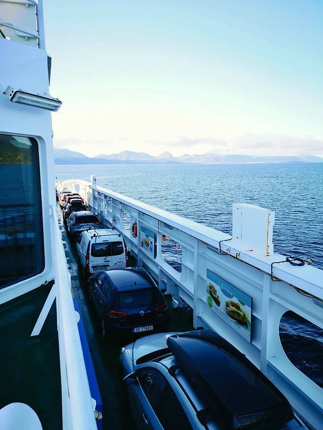 沿途坐了一次轮渡,122克朗,从Fodness到Mannheller,全程3公里。先是排队等上船,然后会有工作人员拿着POS机过来,告诉他几个人就可以了,然后拿好收据。这程不知道是不是因为比较短,没有收人头费,后面有几趟轮渡,除了车辆上船费,还按照人数收了一笔费用。最贵的一次是从Molde到Vestnes,一共是319克朗,也是行程最长的一次轮渡。那趟轮渡,刷完卡还给了一张临时的卡片,下船时候再交还给工作人员,可能是因为那艘船比较大,车辆比较多,怕漏掉收费的。