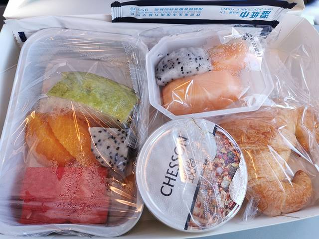 再来夸一夸南航 可以在App上选择餐食 这是水果餐 小倪的是肠粉 没我的好吃😏