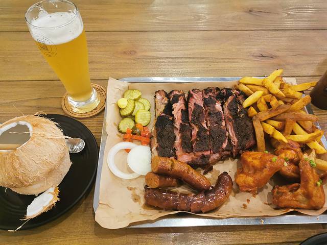 菜是单独点的 然后会拼在一起上 百香果啤酒和椰子 都好喝 猪肋骨两个人点single的就够了 我们点多了 略腻🤪