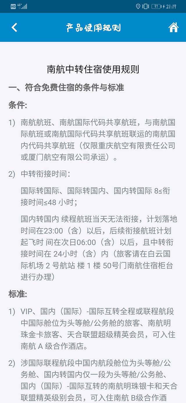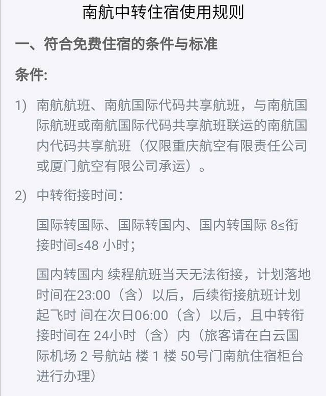 行前一个半月在去哪儿上订了机票 双人往返3000不到 可惜贵阳没有直飞的航班 选择了在广州中转 在这里要夸一夸南航的中转住宿(规则如上👆)