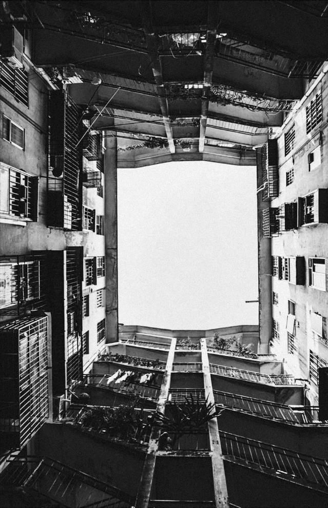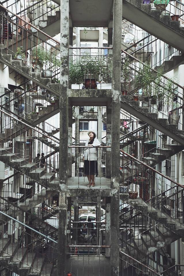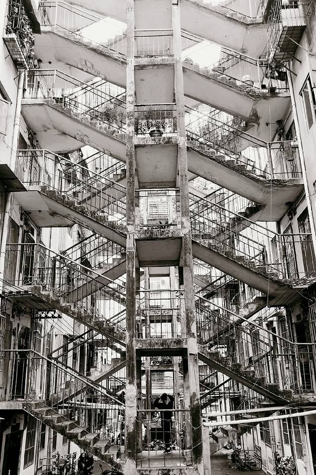 这栋楼,已经有三十年的历史了,很多人,在这里住了半辈子。所谓“鸳鸯楼”其实是两边对称的四栋楼,中间用了三个自上而下的双向楼梯把彼此连接,阡陌交通,层层相依,因为左右完全对称,被称为“鸳鸯楼”。