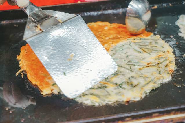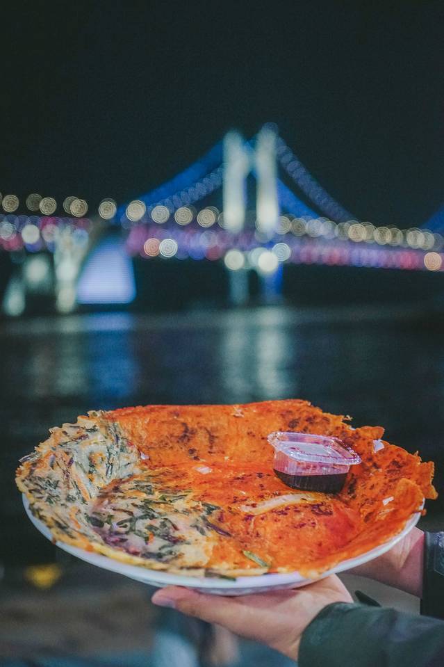 从 机张 回来,直奔厂安里去,这里附近有一个海水浴场,有一个距离学校不远的位置已经坐满了人,我们赶紧先去旁边买吃的,点了一份泡菜韭菜双料饼和一份鱼饼汤,带到阶梯上选了个位置坐下慢慢吃