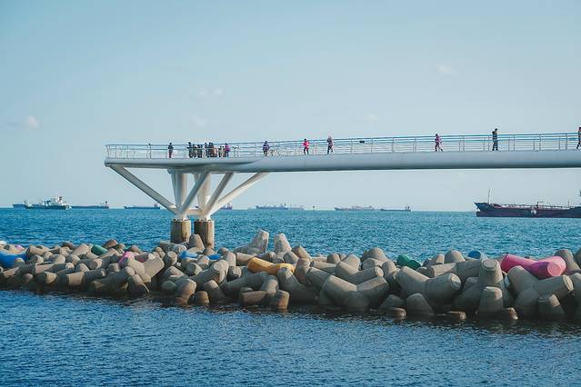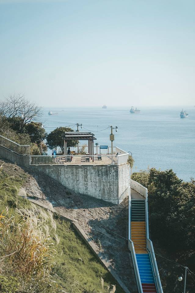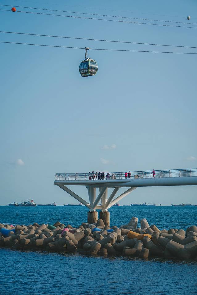 这条步道往两边延伸,头顶上是海上缆车,沿着步道走到尽头,会看见一个登塔,对岸就是城市的景色,观景一流