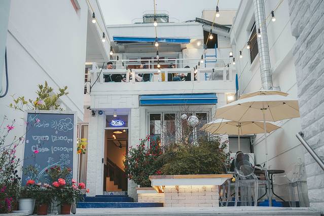 yo姐在 韩国 呆久了,很习惯提早打开ins刷一波附近拍照好看的店,选择咖啡店这种事儿自然也就交给她了,逛了一圈没找着最喜欢的那家,最后决定选一家蓝白色 北欧 风的店,进去歇歇