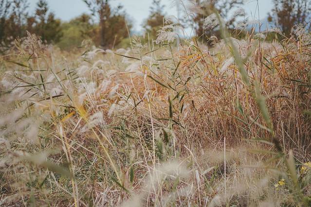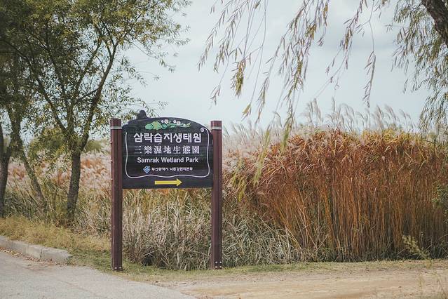 正发愁的时候偶遇到一 韩国 伯伯坐在树下发呆,赶紧跑过去跟他问问路,yo姐用她蹩脚的韩语耐心交流后才知道,我们这已经走到一个叫三乐湿地生态园的地方,这里是当地老人家最喜欢的地方之一,因为附近有很大面积的草地和设施,全都是免费对外的。老伯伯还跟yo姐说生态园里有很大片的芦苇林子特别好看,让我们瞧瞧去,告别热心老伯伯,我们决定再往前走一小段路,瞧瞧这芦苇林子长什么样子,反正,来都来了~