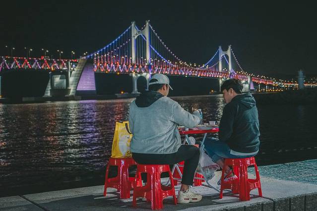 欧巴在 釜山 读书,他跟我们说当地学生有一种传统,花个几千韩币买些小吃,坐在海边吃饭聊天看夜景,问我们要不要去感受一波,我和yo姐这些天试过很多 韩国 美食,还真没试过这么特别的晚餐方式,感觉答应说好,交给欧 巴安 排去