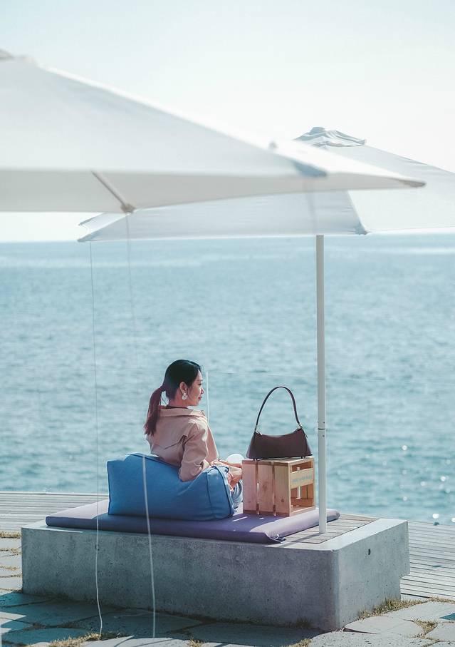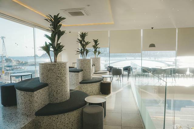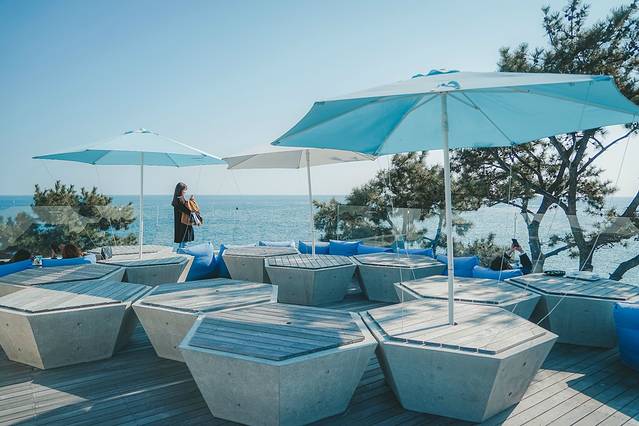 这家咖啡店就看着海边,整个造型很特别,整个店有三层高,户外区域特别美全是各种可爱的沙滩椅和卡座,一望无际的海景!如果怕晒的话楼上室内位置也是不错的海景选择