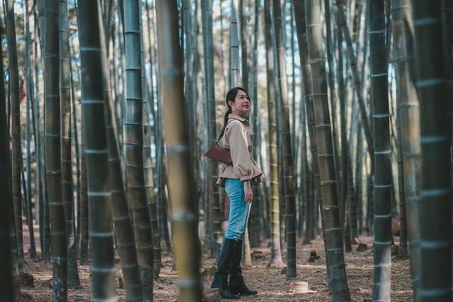 因为我很不合时宜地又穿了高跟靴子出来,大家只好迁就我选了距离最近的一条路,大约走了个十来分钟,终于看见一大片超少人的巨 大竹 林,赶紧拍起来!