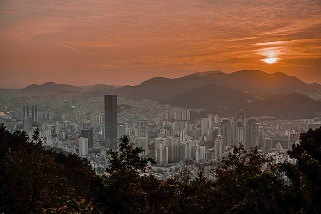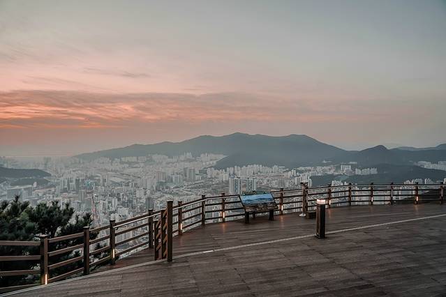 山长水远打车上山,就为了看一眼 釜山 城市,这个城市的制高点荒岭山上有一个暸望台,很多本地人都会特意开车上来看夜景,我们到的时候太阳刚好准备日落,选了个摇摇椅静静等待日落中