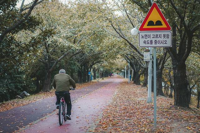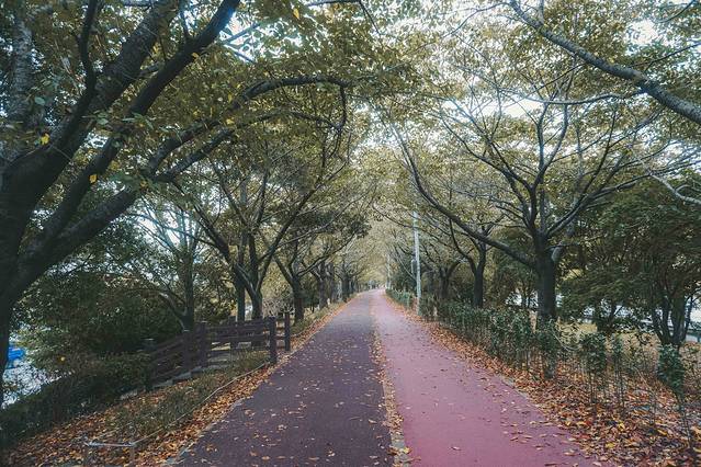 这次来 釜山 ,其实还有一丝丝念想说有没有机会感受到属于 韩国 的秋天,看到大片大片的红色黄色的叶子。为了完成这个心愿,yo姐特意带我跑来机场隔壁的洛东江樱花路瞧瞧,这里有很多林荫小道,春天的时候樱花满天都是,秋天的时候也是绝佳的赏秋胜地,从地铁口出来就看见这条步道,可惜来得还不完全是时候,估计再过个一两星期,这儿的叶子就全变色了!