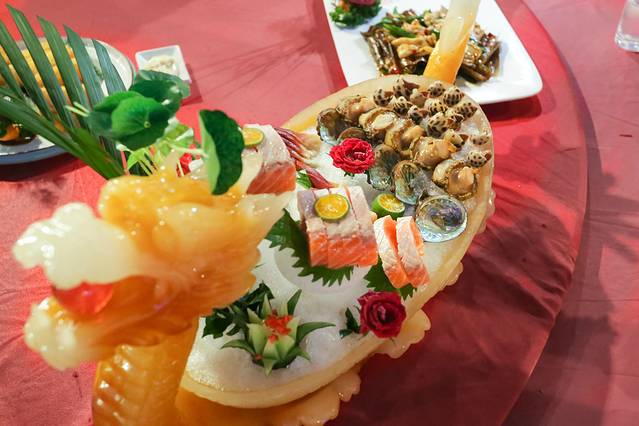 鲍鱼、三文鱼、北极贝做的刺身拼盘真是满满的新鲜感,将不同种类的海鲜一起放在冰上,整齐的摆盘让人看着就有食欲,每一种口感都相当赞。