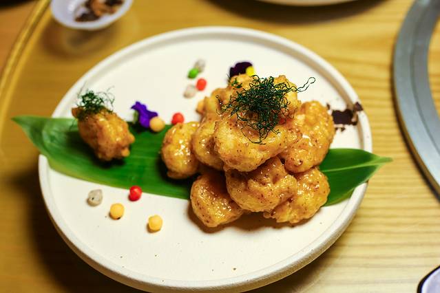 沙汁明虾球用的是一整只剥去外皮的大虾,外面蘸着少许的糊制作而成,非常入味,一个直接送入口中刚刚好,稍微带点酸甜口,是我喜欢的风格。