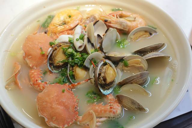 特色菜品:店里的招牌,分别叫做“一碗爽粉”and“一碗打尽”,都是双人份,来三亚吃疍家海鲜粉,这绝对是必吃的,超大一份海鲜,这里面有个头较大的两只蟹、三只鲍鱼、蛤蜊、鱿鱼等,所有海鲜食材铺在米粉之上,看着就好吃,先喝一口汤汁,然后米粉配海鲜,真的是绝了。