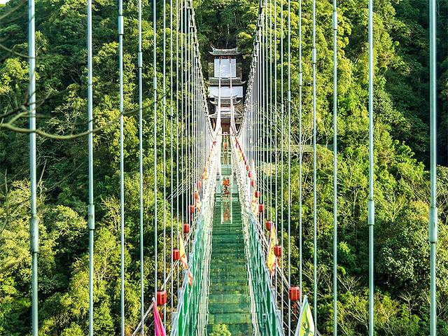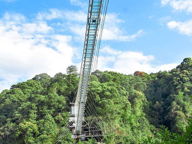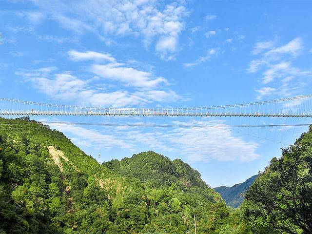 桥上桥下,旦见百丈悬崖,玻璃悬桥跨谷而筑,透明玻璃全程拼接,是福建省内第一座玻璃天桥,悬空于险峻峡谷中,下方就是原始次森林,整座桥长268米、宽2米,高148米,相当于50层楼高!