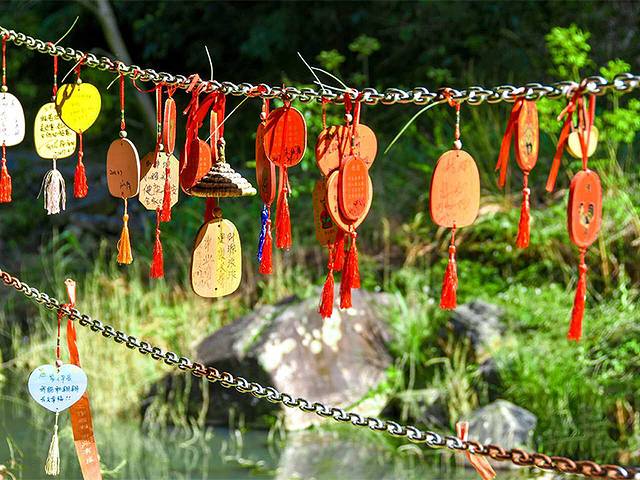 偶遇多彩原木廊桥,美景犹如画作里的境届,树叶微落在桥面,流水如烟,似雾,木制的围栏上挂满了五颜六色的许愿牌,上面书写着无数人的祝愿与祈祷。这些许愿牌长年累月的彼此叠压,现在也成了长生桥上的一道独特风景。