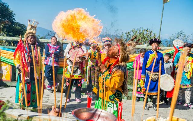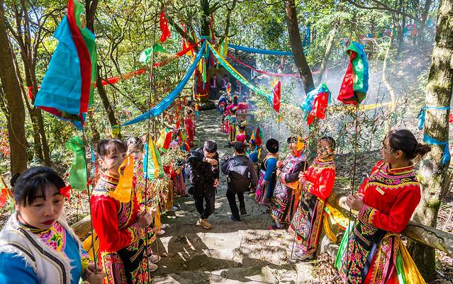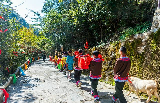 沿着古老的尔玛古道,由族里最受尊敬的释比老人带族中的男男女女,高声唱着羌族庆祝新年的歌曲,喜气洋洋的走向第一个祭祀的地方——神树林。