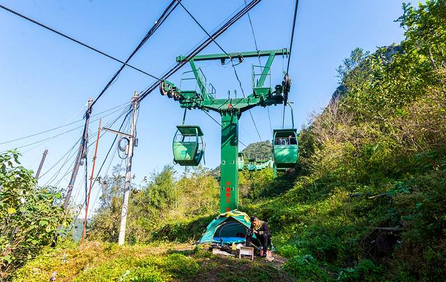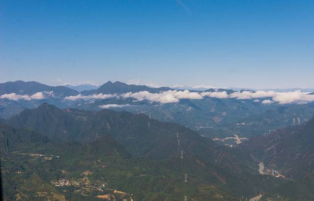 来到九皇山的这一天正好赶上羌族的新年,天气也是出奇的好,前几天都在一直下雨,今天一下就放晴了,在景区大门购买了全程套票后就马上坐第一条索道上山了,随着缆车的爬升,视野越来越开阔,天气好到都可以看到远处的雪山。