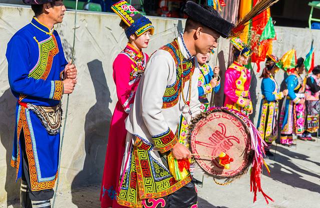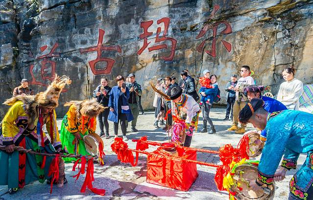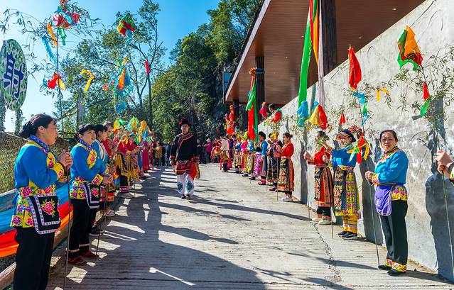 坐第2条索道来到后山,正好赶上到底羌族朋友开始他们新年的庆祝仪式,他们身着盛装站于路两侧,载歌载舞的欢迎着我们这些远道而来的朋友们,美丽的羌族姑娘还给每一个游客的手腕上系上一条红色带,祝福大家新年快乐,万事如意。