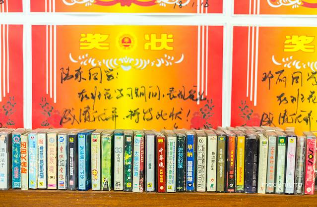 店里的一面墙都贴满了奖状,下面还摆放着很多老的磁带,仔细看了一下,很多都是我曾经拥有的,可惜搬过几次家都不知道去哪里了,好可惜。