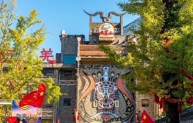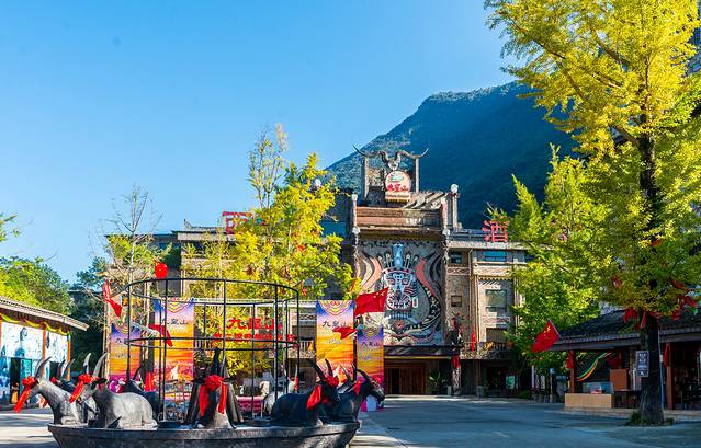 下了第一条索道,就来了一个非常大的广场—西羌广场,广场中间是萨朗晚会的场地,旁边就是西羌酒店和高山温泉,银杏已经有些黄了,有一种秋高气爽的舒适感。如果时间够的话,建议在这里住上一碗,玩完前山后山回到这里,就可以好好的享受一下高山温泉,欣赏一场晚会,再回酒店休息,这应该是九皇山最完美的玩法。