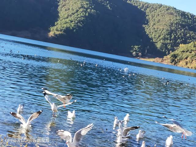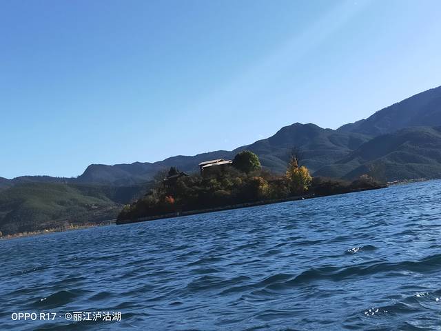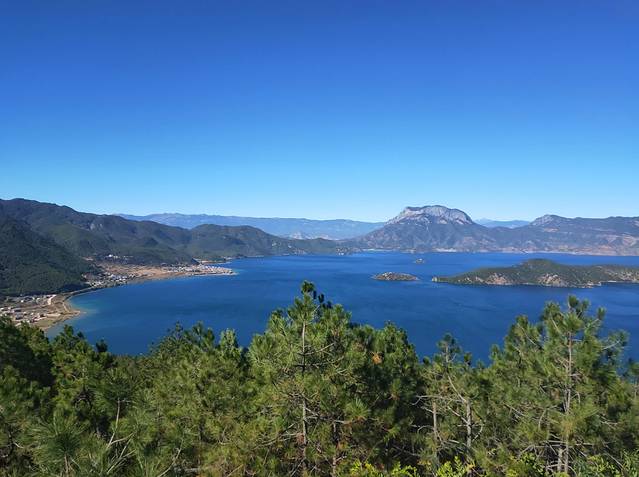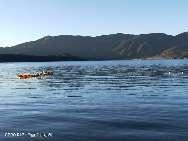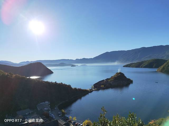 12、一颗沉醉在云贵高原青黛之间的明珠,格姆女神前世遗落的一颗眼泪。神山仙岛画湖中,日照三时景不同。渔曲槽船闲唱渡,素裙飘处鹤翔空。