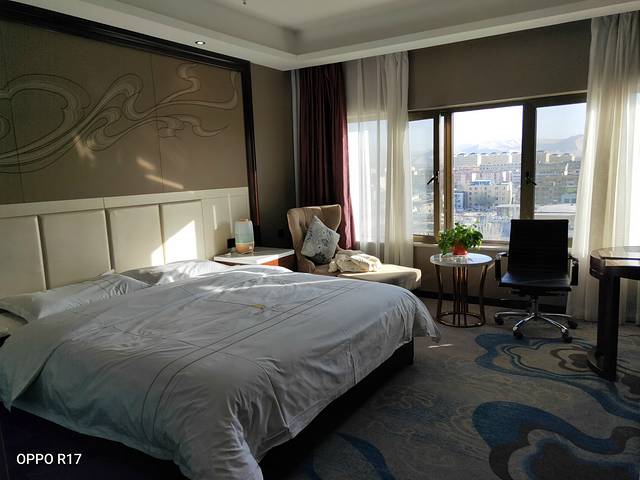 这样才116元。我当时定标间,两张床的,给我升级。窗外马路对面是小学,晚上很安静,可以在窗边躺着观看夜景。开暖气和加湿气,有洗衣服务,薄的在房间凉着隔天早上就干了。睡得很舒服,洗漱用品齐全。只是在敦煌玩得嗨,没睡多少。