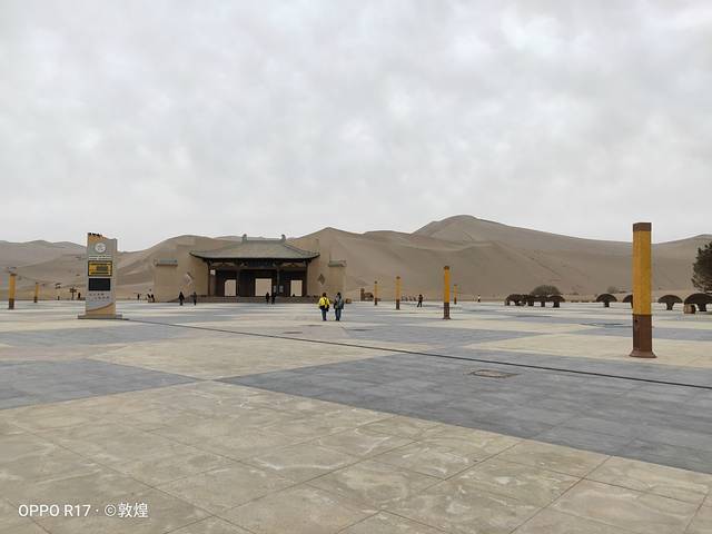 机场与酒店相距14公里,开车不久就到了。酒店在反弹琵琶这个十字路口,向南方向---鸣沙南路进去一小点就到了,步行一分钟就可以到酒店。到了酒店,询问酒店人员,坐公车,很方便。去莫高窟要到丝路怡苑大酒店的对面的公交站坐。去鸣沙山,出了酒店就有公车。公车到19点。