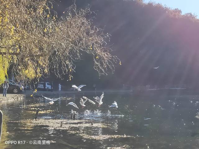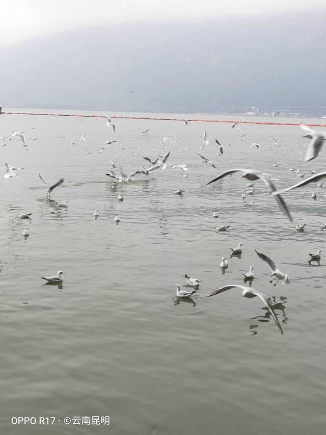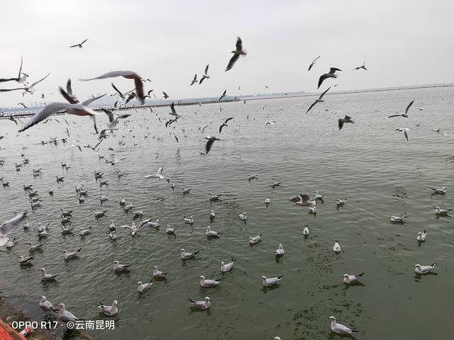 入住后便去滇池,海埂公园看海鸥。在翠湖到滇池坐公车要转一次,一个多小时才到滇池。到了滇池已经下午15:48了。问了交警大姐,说海埂公园的大坝离这里,坐公车还要两个站,大约40分钟。那算了,我在滇池这玩下就算了。滇池那人山人海,喂海鸥的面包一条15元,也有2条15元。卖面包的像泸沽湖那一样,不断跟在你的身边,让你买。我跟他说,我自己都舍不得买面包来吃,我会买给它们吃?卖面包的这才走了。
