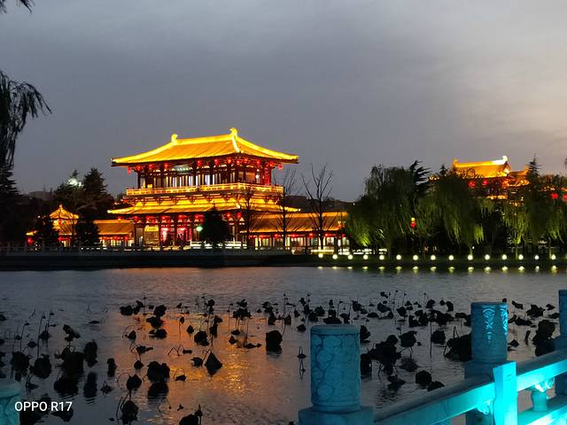 到了芙蓉园地铁出口,就是大唐芙蓉园。当时已经17点多了。购票120元进去,售票的美国靓女,中文很好,她说能逛到22点。有自动讲解器,25元,得100元押金。此时的天已经很冷了。上午出来还好,没有带围巾,穿的也少。