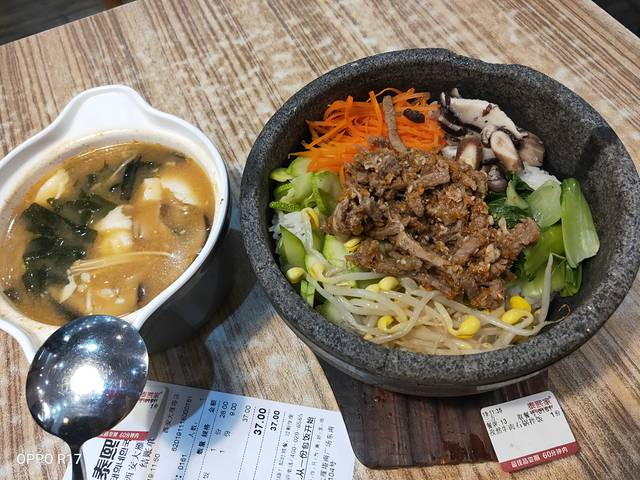 韩国的味增汤,一份15元,石锅饭22元,以为是像平时小份的,没想到汤很大的一份,石锅饭也多,吃不完。锅是一直热着的,从一开始就要开始拌饭,一边吃一边拌,一直能听到滋滋的热饭声,好吃。我看周围的小姐姐,点个汤和一点小吃就够了。