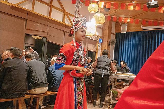 还记得第一次体验长桌宴是在广西的侗族大寨,没想到在我们浙江也有。畲族长桌宴是当地村民用来招待宾客的一种独特民族礼仪,盛大节日时是在村民文化礼堂内露天而坐,这次因为天气转凉,我们是在室内进行的,不过热闹的氛围同样不会减少。