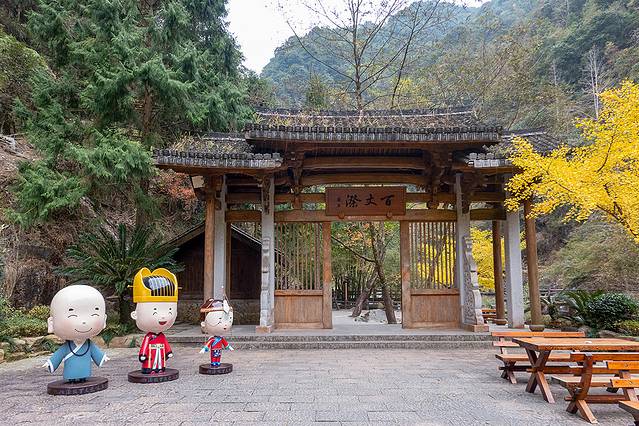 其实几年前第一次来温州文成时,就有经过百丈漈景区,却因为那时是自驾游车队统一行动,行程中没有安排百丈漈,所以没能进去参观。当时看到“百丈漈”这三个字就令人非常向往,也许是想探究一下为什么当地人把瀑布称为“漈”吧,总之这次终于如愿以偿。来到百丈漈景区南门入口处,只见大门旁边立着三个憨态可掬的卡通形象,正是文成县的旅游吉祥物“福福”、“成成”、“文文”。