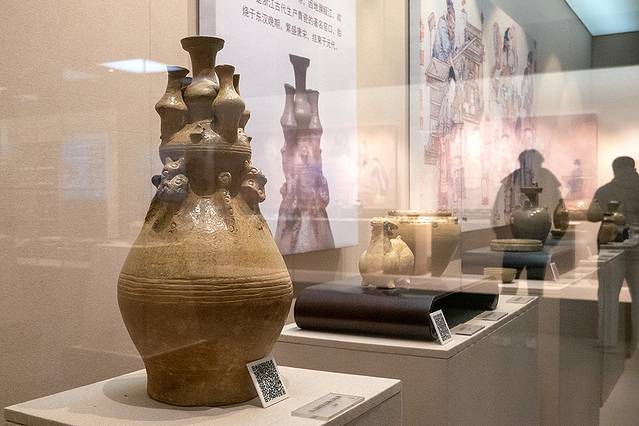 博物馆一楼是临时展厅,二楼三楼为基本陈列,步入二楼,首先是利用当地丰富的动植物、矿物资源介绍了文成的秀美山水和富饶物产,接着就是馆藏的各年代文物啦。这件东汉瓯窑青釉五联罐,罐身上方五个小罐相联,是一种随葬明器,是瓯窑创烧于东汉晚期的重要例证。