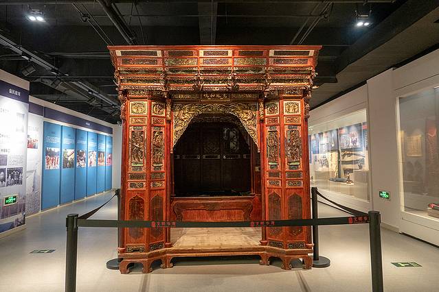 晚清雕花大床:二进拔步床,全部为实木榫卯结构,雕刻精美细致、色泽艳丽。木床前挂落为鎏金双凤透雕,雕工复杂。楹联上书:鸾凤和鸣;内屋床前上书:熊罴叶梦。前者比喻夫妻和谐,后者祝福新人早生贵子。三楼还有华侨厅展示文成最具特色的侨乡文化,总体而言这座博物馆还是非常值得一看的。
