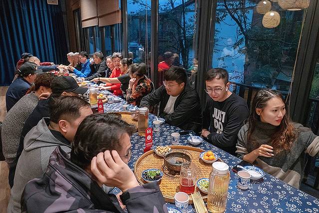 虽然在室内,长桌宴的桌子也相当长,宾客沿长桌两侧入席,每四人以一个圆筐围坐而成,一道道美食陆续端上来均放在圆筐内,左右各坐着其他桌的食客,享用美食时互不打扰却又其乐融融,相当有趣。食物以当地特色土菜为主:炒粉干、牛肉炖萝卜、炖土鸡、糯米山药……,虽然乡土,却都是按照标准化操作的,长桌宴打造成为让川村的招牌体验项目。