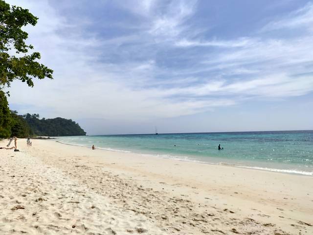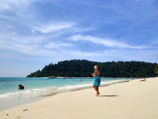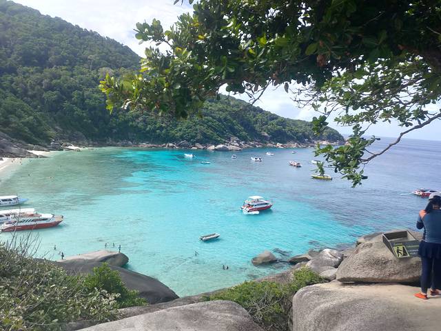 斯米兰是超级的远。要去的话建议好好考虑一下,因为实在是太远了,出发的码头不在普吉岛,已经到了攀崖府。我们住在镇子上,车5:40来接我们的,开了一个多小时出了普吉岛,再开一个小时才到了码头。然后坐船两个小时才到斯米兰,一个岛才放一个小时,浮潜才半个小时,水质和皇帝岛差不多,也浑浊呢。在8号岛有观景的石头,上来下去基本上就没有时间转了,包括皇帝岛,也没有到岛的里面去转,就是在海滩旁边坐了一坐,如果想探索岛屿的话,时间是非常不够的。从石头上面看斯米兰是挺漂亮的。海滩上面乌央乌央的全是人。回来的时候坐船又坐了两个小时,坐车因为晚上到了普吉岛也堵车的时间,所以晚上坐车就坐了三个小时才从码头回到酒店。