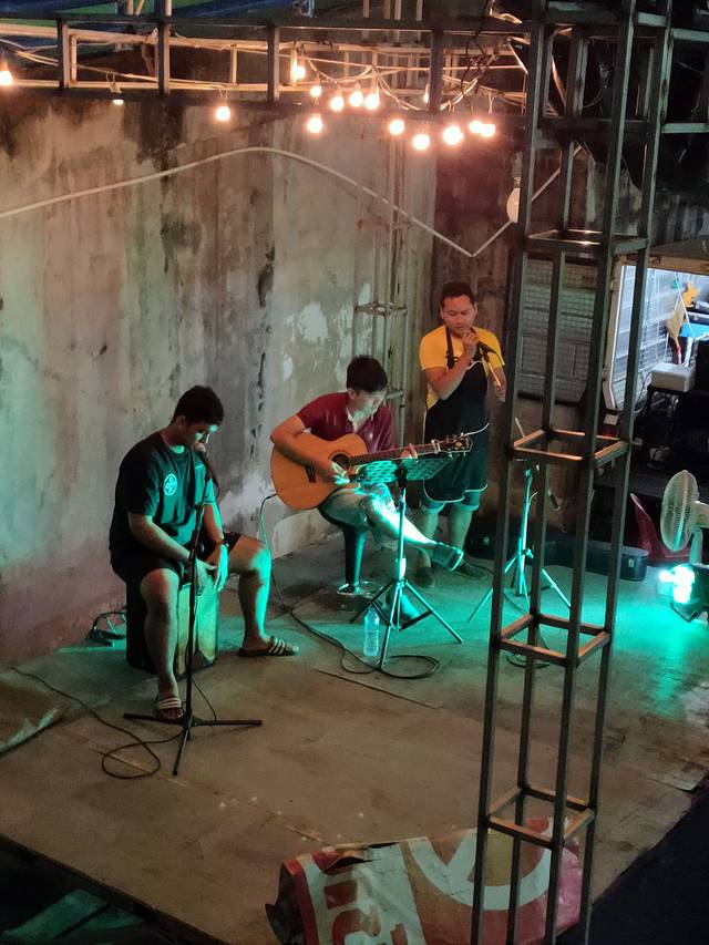 然后在夜市的尽头,有几个大排档的小哥哥在面对着空无一人的场地唱得非常投入,而且唱的确实不错哦,泰语歌也蛮好听的。然而下面没有一个观众,现在桥上等车的我为他们的精神鼓掌。